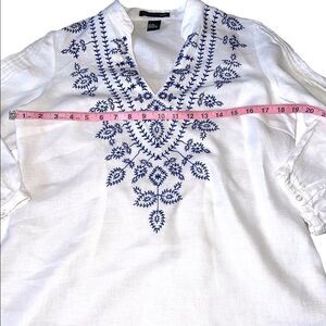 Gorgeous linen top from Saint Tropez West. Features 3 1/4 length sleeves, thick high quality linen and gorgeous blue embroiders along the chest area.