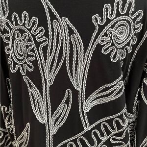 Saint Tropez West black top with silver/metallic soutache flower trim size 1X. Polyester, rayon and spandex blend. Boat neckline, 3/4 sleeves. Braided threads are stitched into the designs. Approximate measurements are pit to pit 24”, length from shoulder approximately 25”.