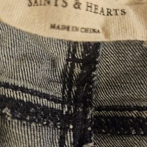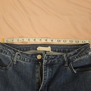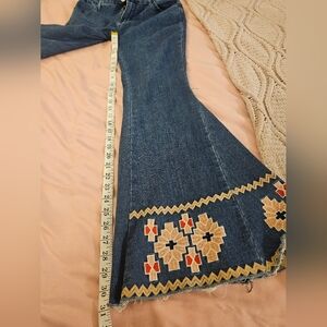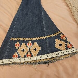Stylish blue jeans with unique floral embroidery. Perfect for a chic, bohemian look.