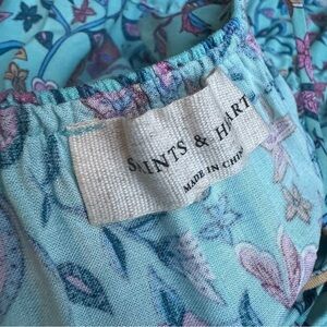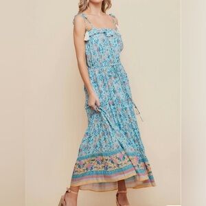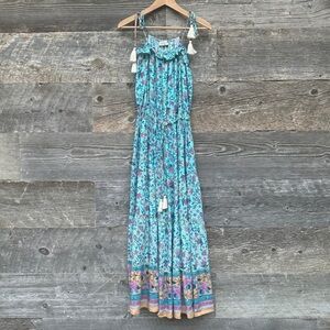 Saints & Hearts Maxi Cottagecore Boho Floral Print Blue Sundress Flowy Tassels
