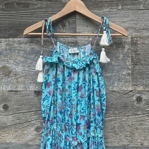 This Saints & Hearts mxi dress has beautiful bohemian details. It features an adjustable spaghetti strap top, drawstring waist and semi-full skirt. It is woven in an all-over blue and pink floral pattern with an eyelet-trimmed contrasting pink and orange pattern along the hem ruffle. Tassels on the shoulder straps and a petite ruffle trim detail along the top finish out this adorable dress.