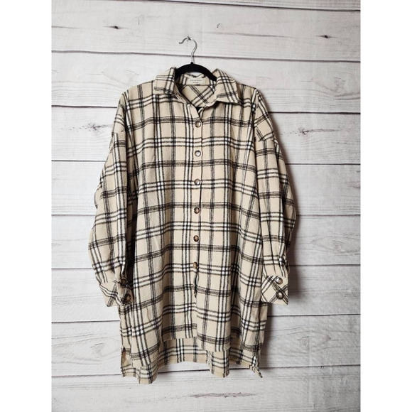 Saints & Hearts Womens Blouse Beige Black Plaid Button Long Sleeve Boyfriend M