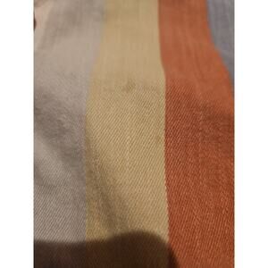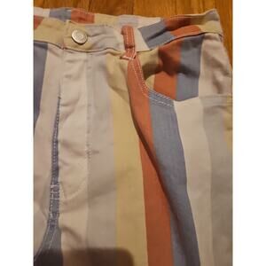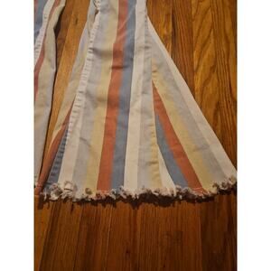 Saints & Hearts Women's Size L 30x34 Bell Bottom Flare Leg Pants in Rainbow Striped offer a unique and stylish addition to any wardrobe. There are a couple of small stains. They're not very noticeable I did and pictures of them. Made from a comfortable denim fabric with a high-rise and flared style, these pants feature a zipper and button closure, 5-pocket design, and a vibrant multicolor striped pattern. Perfect for all seasons, these versatile pants can be machine washed for easy care, making them a practical and fashionable choice for women looking to make a statement.
