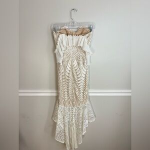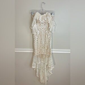 Saints + secrets white lace embroidered off the shoulder dress.. size S! This is perfect for any occasion; bridal shower, vacation or a summer night out in the town! It is lined, has ruffle trim & high and low style. No flaws.. perfect condition.