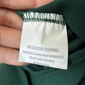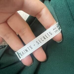Saints + Secrets emerald green asymmetrical dress with one-shoulder bow detail. Ruffle-trimmed asymmetric hem. Back zipper closure. In excellent condition. Size medium - 17" pit to pit; 14" waist.