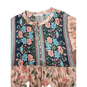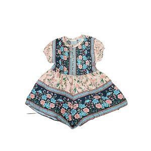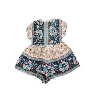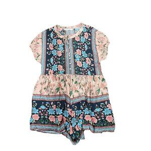 This Saints + Secrets romper is a must-have for any bohemian lover. The teal and peach floral pattern is perfect for the summer season, and the flared leg style adds a playful touch. The romper features short sleeves, a round neckline, and a button closure, making it easy to wear and style.