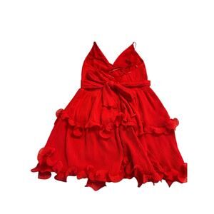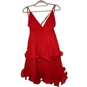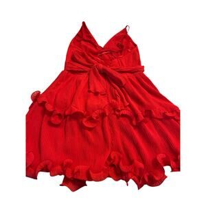 Gorgeous Saints + Secrets red mini dress featuring thin adjustable straps, a deep V-neckline, back zip and a waistband that adds a bold, flirty touch. The ruffled hem creates a fun, feminine silhouette. This eye-catching party dress is perfect for vacation, date night, clubbing, summer weddings, or girls’ night out. Lightweight fabric and flattering fit make it a standout choice for any event. In excellent pre-owned condition.