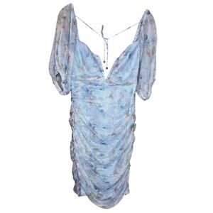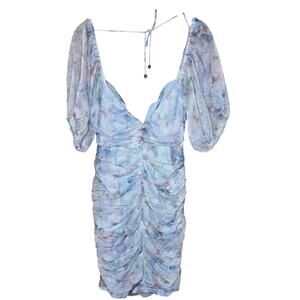 In very good condition from Saint + secrets sold on boutique website selfie Leslie womens size medium Good Vibes Puff Sleeve Deep V-Neckline Mini Dress Floral Print Blue dress soft feminine bohemian made with high quality chiffon style fabric