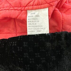 Fully lined in a pretty orange quilted fabric lining. Button front closure. Collared necklined. Slit pockets. Soft and snuggly black silk velvet with a burnout pattern.