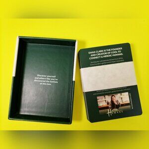 Wellness set of 25 connection prompts card deck in box. Features gold and dark green design. Perfect for meaningful interactions, 25 cards with questions to journal, share, post, connect, social share.