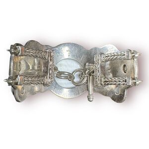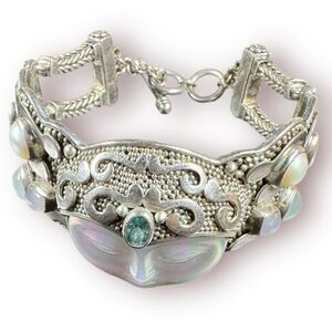 This stunning and very unique Sajen sterling silver brace is set with a stunning oval-shaped Welo opal. The opal's white color is reminiscent of a full moon, and is complemented by the intricate sterling silver design of the bracelet. The welo opal or otherwise known as the Ethiopian Opal is believed to stimulate creativity and inspiration. It is said to encourage artistic pursuits and the free flow of ideas. This gemstone is thought to help balance emotions