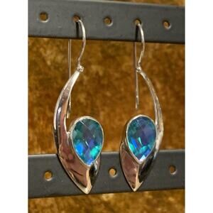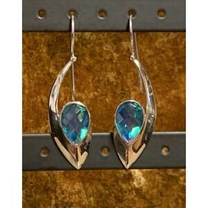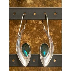 These Sajen earrings are handcrafted in India with sterling silver and faceted rainbow quartz stones that showcase beautiful shades of blue and green. The asymmetrical shape and fishhook closure make them secure and comfortable to wear. Signed by the brand, these earrings are 1.75 inches long, 1/2 inch wide and feature two pear-shaped quartz stones, perfect for adding a pop of color to any outfit. Made with 925 sterling silver, these earrings are a unique and stylish accessory for women who appreciate artisan jewelry. Marked Sajen, 925 and India.