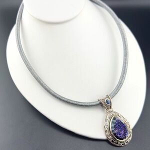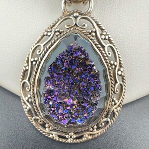 Sajen Purple Druzy Stone Pendant Sterling Silver Necklace. 16 to 18". Pendant is 2" tall by 1.25" wide. Great condition! Light expected tarnish. Stone on bale is blue.