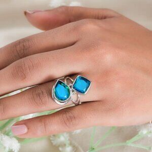 This is a two-stone Sajen ring symbolizing balance and unity. The craftsmanship is amazing. It is Sterling Silver covered in a perfect layer of rhodium. Giving it that added protection and appeal. The gemstones themselves are pear and cushion shape rainbow Caribbean quartz. No photos do this ring justice. The amazing blue and green sparkle as the light hits it from different angles is absolutely stunning. I have this ring brand new in a size 7 and size 6. It does not come in a Sajen box. They come in a grey gift box with a Sajen booklet. They cost $99.99 normally but you can get them today for $70 a piece saving you $29.99. If you have any questions don't hesitate to ask. Measurements are in the photos.