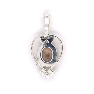 This auction is for a lovely woman’s pre owned pendant. This is designed out of sterling silver and features a 10mm x 11mm white druzy stone. The pendant measures 1 1/8” by 5/8” and has a weight of 3.2 grams. On the back this is marked Sajen. Very nice condition.