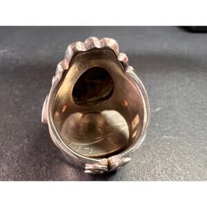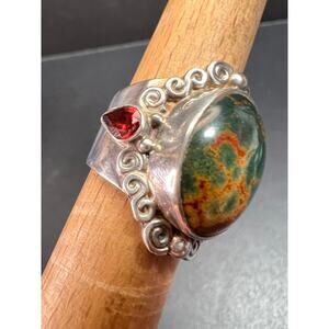 Signed Sajen ring in genuine beautiful bloodstone with two pear cut garnet gemstone accents set in authentic 925 sterling silver. Measures a size 6 and has a total weight of 13.84 grams.