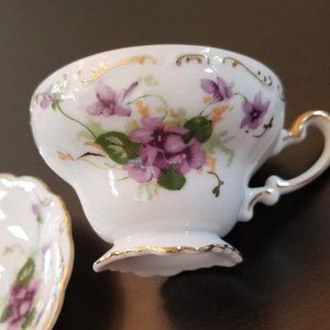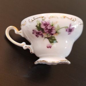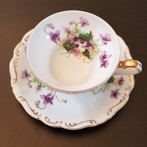 Gold rim. Major side has larger floral design. Fancy handle, cup base is rectangular with scallops