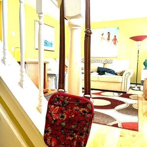 Colorful bag with zip top closure, pockets on front and back, adjustable strap extends to 23.5”. bag measures 9.5x8, great condition!