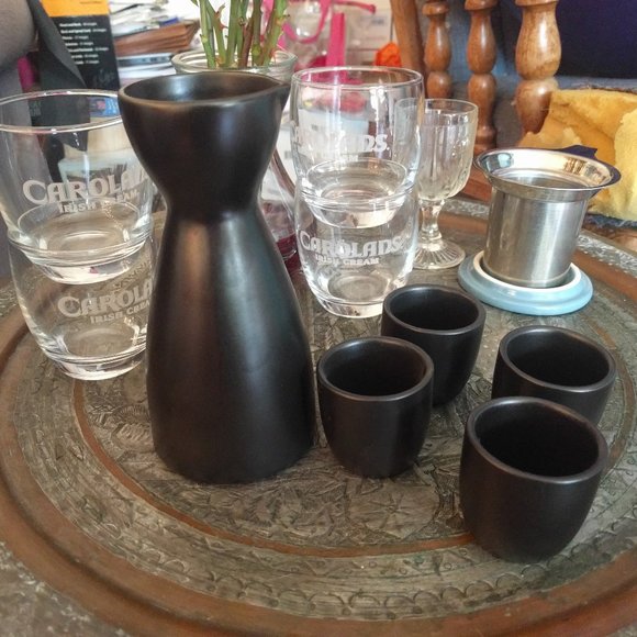 Black Sake Set, 4 sake cups and pourer. Pourer can be heated (place in water in pot and slowly heat, do not boil). I love this set, but don't use often. Sake set is in foreground, please excuse the back ground. Can be used for drinks other than sake as well. Happy to take offers.