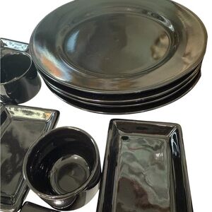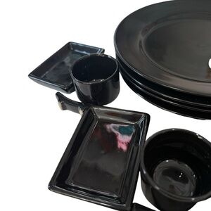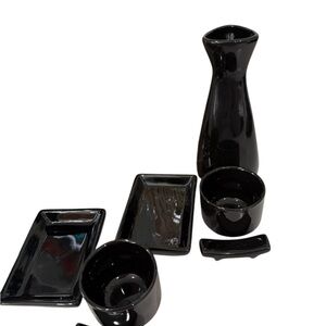 Sake and Sushi Set Black with Sake Carafe Cups small and Large plates chop stick holders. Sake and Sushi set from Japan complete with all the pieces shown in the photos including chopsticks. This set is in excellent condition.