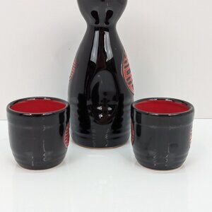Saki Set 3 Piece Black and Red Ceramic 1 Tokkuri and 2 Ochoko