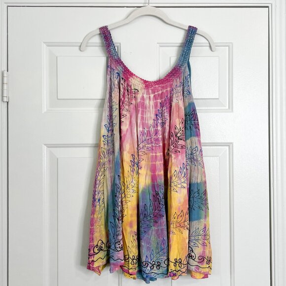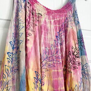 This dress features a scoop neckline adorned with delicate picot trim and adjustable spaghetti straps for a perfect fit. The handkerchief hem adds a playful touch to its flowing silhouette, while the vibrant blue tie-dye pattern ensures you stand out. Ideal for casual outings, beach days, or summer gatherings, this dress pairs effortlessly with sandals and your favorite accessories for a chic, laid-back look.