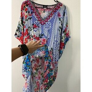 Sakkas O/S Laisson Flowy Hi-Low Caftan Coverup Dress/Top Rhinestone Boxy V-Neck