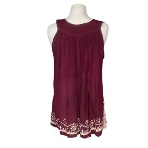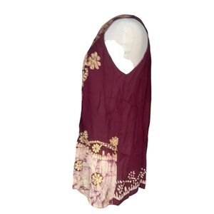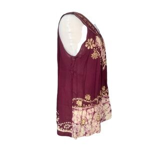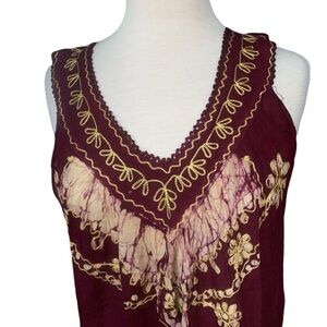 This sleeveless top by Sakkas features a V-neckline and intricate embellished floral pattern in a deep burgundy color, creating a feminine and relaxed look. Excellent condition with no stains, rips or missing buttons.