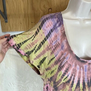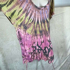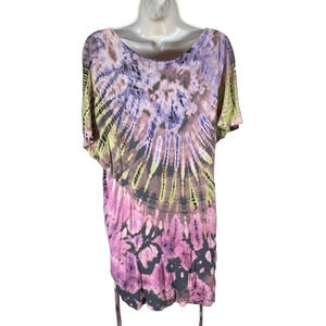 Stylish tie-dye tunic with a scoop neckline. Features pink, green, and brown hues. Perfect for casual wear.