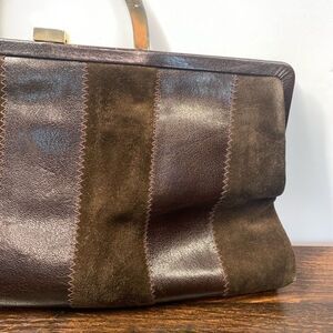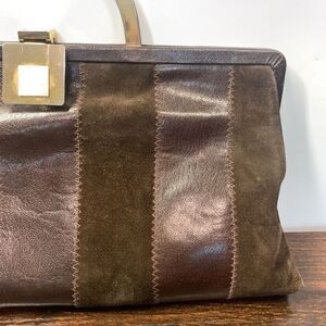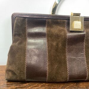 Sakowitz Women's Striped Leather Suede Gold Metal Arch Handle Handbag Brown