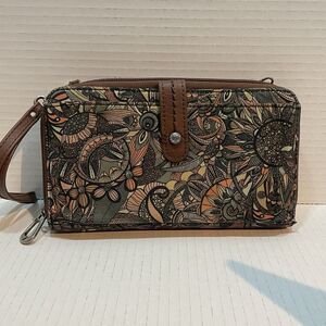 Sakroots Artist Circle Crossbody Boho Floral Wristlet Wallet Satchel Green Brown