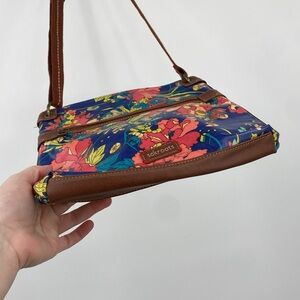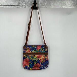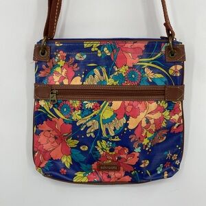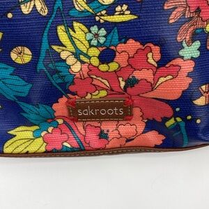 Sakroots Artist Circle Flat Crossbody Sling Bag Womens OS Blue Yellow Floral. Adjustable Single Strap. Bag Has a Zip Closure. Front Pocket with Zipper. Lined. Zip pockets inside the bag.