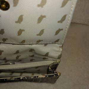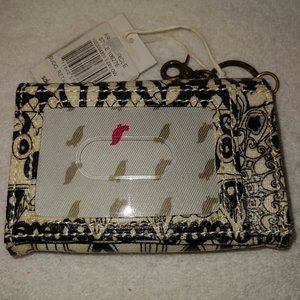 Small ID wallet, but has several pockets for its compact size, style is 106276, and the pattern is B&W OW (obviously black and white but I was unable to find a reference regarding the OW. Could be owl, I'm not sure). Clear ID holder on the outside back, on the inside of the snap flap there is a slip pocket, then there is a zip pocket in the main compartment with slip compartments on either side of this.