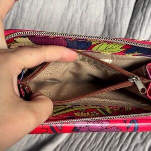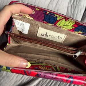 Sakroots wallet with vibrant floral patterns. Features red, pink, yellow, and blue tones.