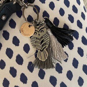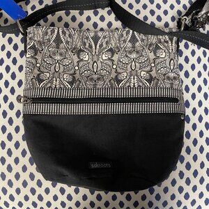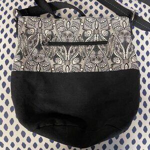 Jute & cotton purse has an adjustable strap, 2 exterior zippered pockets, 1 interior zippered pocket and 2 interior slid in pockets. It is in excellent condition with no rips or stains.