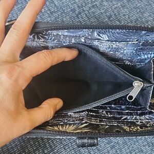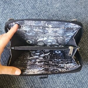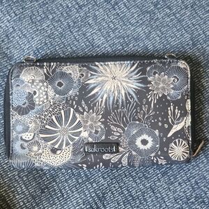 Stylish Sakroots wallet with ocean and turtle design. Features secure snap closure and cell phone pocket. Good condition. Includes removable strap.