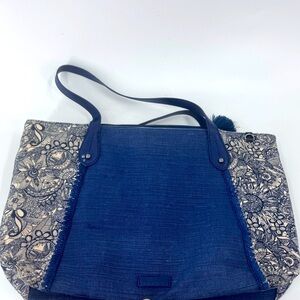 Sakroots Blue Denim Artist Circle Floral Tote Bag with stylist pins .