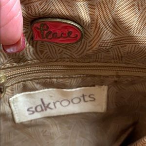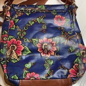 Vibrant crossbody bag with floral design known as “True Love”. Features blue background with pink and green accents. Has multiple pockets and credit card slits to carry everything you need! Brown adjustable strap. Perfect for traveling! Lining on bottom eating away but doesn’t affect the functionality of this cute purse.