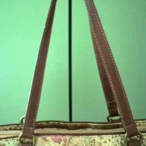 Cute gently loved Sakroots bag in a beautiful brown and tan woven design. 12” L x 8”H x 4”W. One tiney white spot on handle is all I can see for signs of use. See items pictures as they are part of the description!