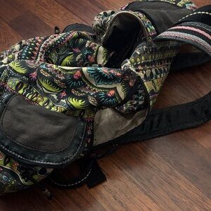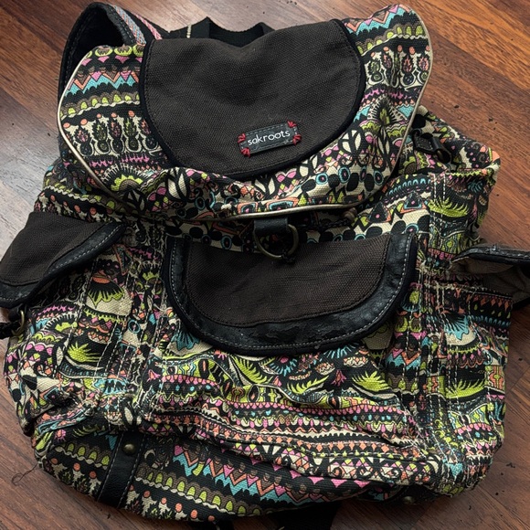 Sakroots backpack with intricate multicolor design. Features flap closure and multiple pockets.