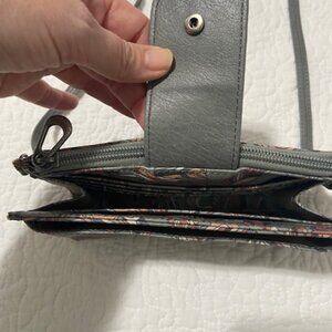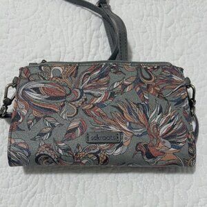 Sakroots Crossbody Wallet/Purse. This is a wallet type purse with removable strap. Purse is gray with orange, navy and beige hues. It's a flower/feather/bird pattern. Purse is in excellent condition with little use.