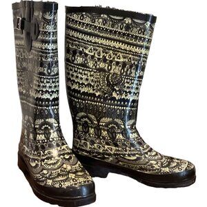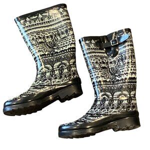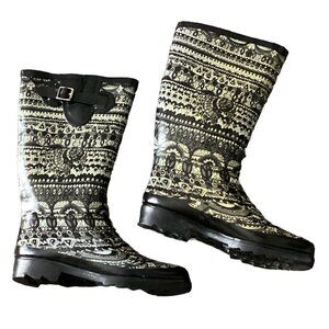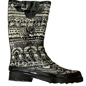 Description: SakRoots Women's Peace Sign Mixed Pattern BOHO Hippie Artsy Faux Fur Lined Rubber Waterproof Wellington/Rain/Snow Boots, Pull Ons with Buckle Strap Adjustment at Top. New without box.
