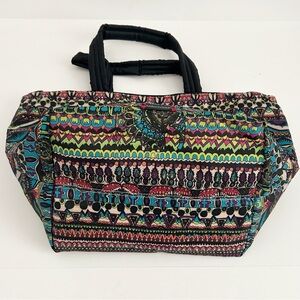 Embrace the vibrant charm of the Sakroots reversible tote set, showcasing a captivating blue and pink geometric pattern. This stylish tote and matching pouch are perfect for carrying essentials with a touch of bohemian flair. Crafted from durable textile material, they offer both functionality and a bold aesthetic. Magnetic snd zipper closures.