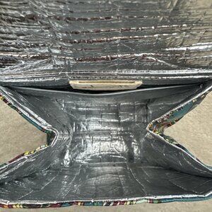 The Sakroots Lunch Bag Box is a stylish and functional insulated lunch bag made from coated canvas with a unique bird pattern design. Featuring a rectangular shape and a small size, this lunch bag is perfect for casual occasions with a colorful rainbow spirit desert pattern. The bag has a hook and loop closure, a top handle for easy carrying, and is designed to keep your food fresh with insulated features. Perfect for women who appreciate artsy and nature-inspired designs, this lunch bag by Sakroots is both practical and fashionable for carrying your meals on-the-go.