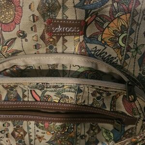 Stylish Sakroots backpack with vibrant patterns. Features a front zip pocket and spacious interior. Perfect for everyday use.