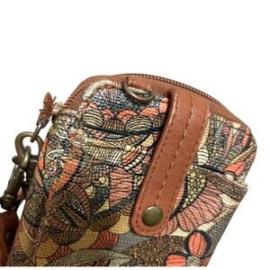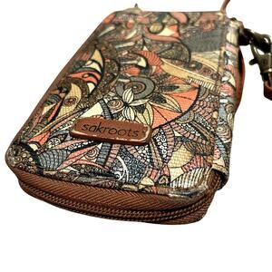 Sakroots Salinas Smartphone Crossbody Bag / Wallet - featuring a beautiful boho design throughout with a removeable adjustable crossbody strap. Interior contains eight credit card slots, one clear ID window, one side slit pocket and a zipper pocket. Bag has some very light wear on the corners (see photos), otherwise in good condition.