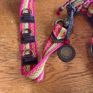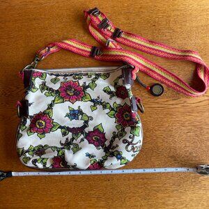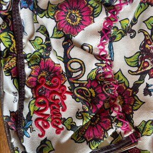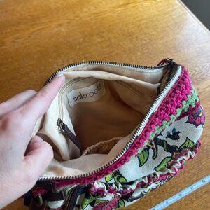 Sakroots, multi colored, floral print with "True Love" embroidery, one large pocket on front and three small interior pockets, zipper closure for secure storage, adjustable strap with decorative trinkets and buckles, made from durable eco-friendly materials