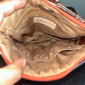 Sakroots bag, in good condition - peeling throughout, mostly around hardware (see pictures). Wrapped Canvas exterior with textile adjustable crossbody strap. Zippered front pocket, large snap closure back pocket. Zippered interior pocket with open side pockets and zippered side pocket. Measurements in photos.