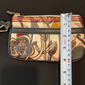 Cute boho Sakroots The Sak wristlet for phone, money, cosmetics, wallet, etc. Wrist strap can be clipped to bag for wrist carry, or clipped/attached to another bag, purse, belt loop or belt. Interior key tether strap keeps your keys handy and can be hung inside or outside of the bag. Exterior pockets with hook-and-loop closure, interior open pocket. Bohemian style. Multicolored: dark brown, burgundy red, creme, mustard yellow. Botanical/ bird graphic print pattern. Exterior PCV, other polyester. **NOTE: the finish on the wrist strap is defective/fair--flaking off, (probably from hand sanitizer) so it can be rubbed completely off, left as-is, or cut off and bag used only as a clutch/wallet accessory. ** See photos. Priced accordingly. The rest of the bag is in excellent condition. Approx 7"x4"x.5". See photos.