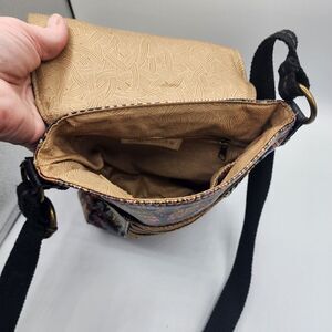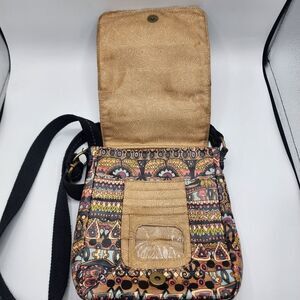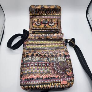 Sakroots crossbody One World print coated canvas front fold flap 46" adjustable strap